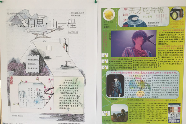 本次作品展类型丰富,包括山水画版面设计、娱乐报版面设计、体育报版面设计、游戏专栏、明星专栏等,共计42件作品。作品构思新颖,独出心裁,具有自己的思想和风格,吸引了全校师生驻足参观。