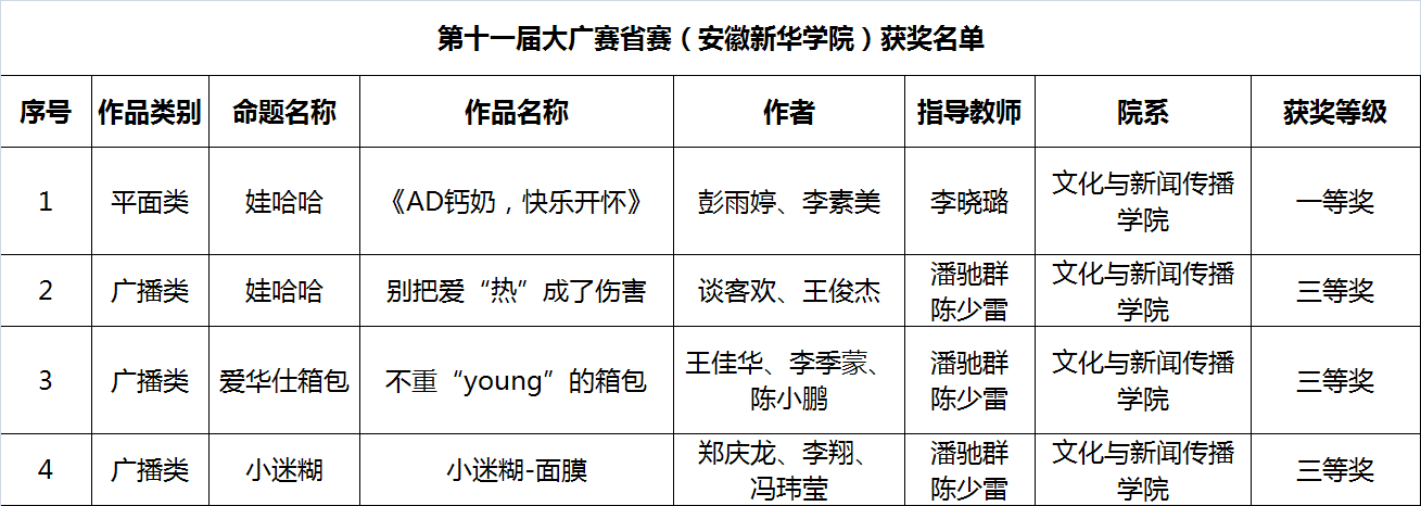 本网讯(通讯员:李晓璐)7月7日,第十一届全国老员工广告艺术大赛安徽赛区评选工作在安徽建筑大学艺术馆圆满结束。此次评比,公司一组平面类作品与三组广播类作品在全省25594组参赛作品中脱颖而出,获得喜人佳绩。其中由李晓璐老师指导的平面类作品《AD钙奶,快乐开怀》荣获省级一等奖,潘驰群老师和陈少雷老师指导的三组广播类作品《别把爱“热”成了伤害》、《不重“young”的箱包》、《小迷糊——面膜》分别获得省级三等奖。公司获奖名单如下: