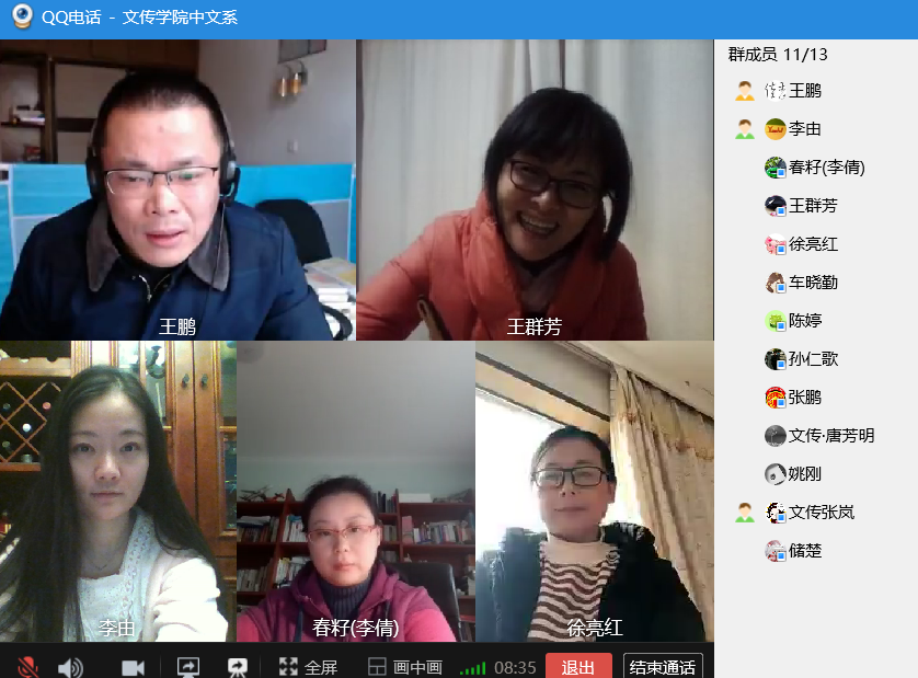 本网讯(通讯员:李由)为保证线上教学各项工作扎实推进,根据文化与新闻传播公司教学工作的统一部署,中文系于3月6日下午通过QQ群召开视频会议开展教研活动,就近期工作做相互交流与讨论。会议由王鹏助理主持,全体中文系汉语言文学专业和学前教育专业教师参加。