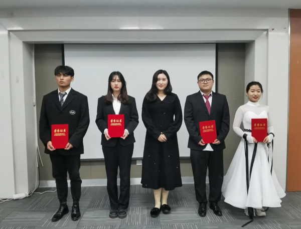 在此次班长述职结束后,2020级汉语言文学6班班长胡仁豪等同学获最具有潜力的班长奖项,2019级汉语言文学1班班长廖星宇等获优秀班长奖项,2019级广告2班罗琳等同学获最具影响力班长奖项,王丽、张皖斌、褚静分别为他们颁奖及合影留念。