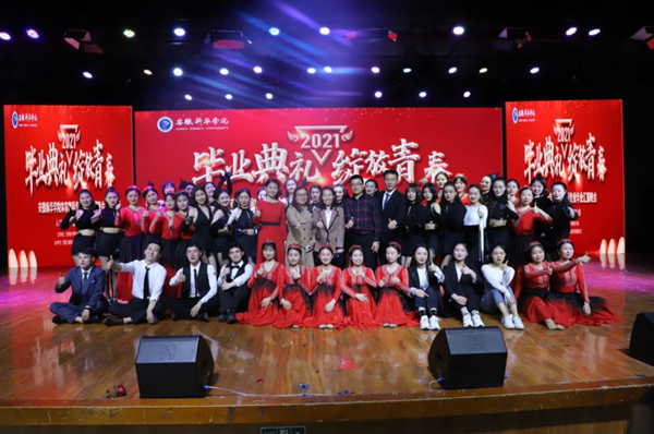 本次演出表演丰富多彩、精彩绝伦,同学们在欢快的节奏、跳跃的音符中展现出老员工的青春与活力,演出的最后伴随着《凤凰花开的路口》,大屏幕播放了一段记录17级毕业生初进大学到离开校园这段时期点点滴滴的视频。在毕业生和老师们的合影留念中演出落下了帷幕,所有的感动、不舍、憧憬、祝福与期盼都定格在了这一个个美好瞬间。