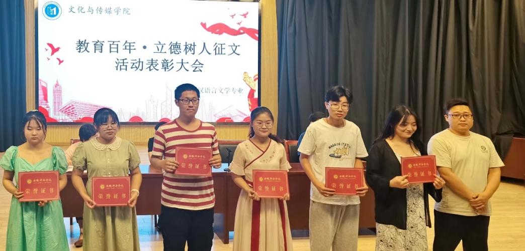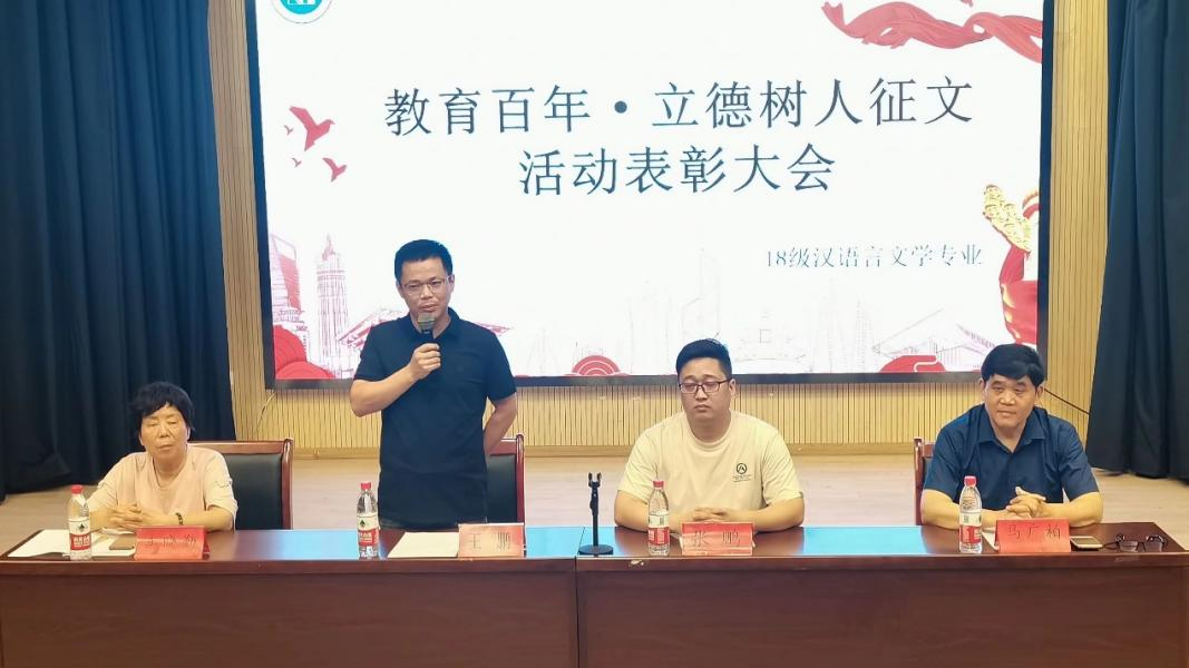 本网讯(通讯员:张问静)为表彰太阳成集团122ccvip学子在此次“教育百年,立德树人”征文活动中取得的优异成绩,同时弘扬人文精神,激励有志青年。6月8日,“教育百年,立德树人”征文活动表彰大会在新闻演播厅举行。参与本次会议的有教学副经理王鹏,中文系主任助理张鹏,教授马广柏、车晓勤以及汉语言文学专业的员工。