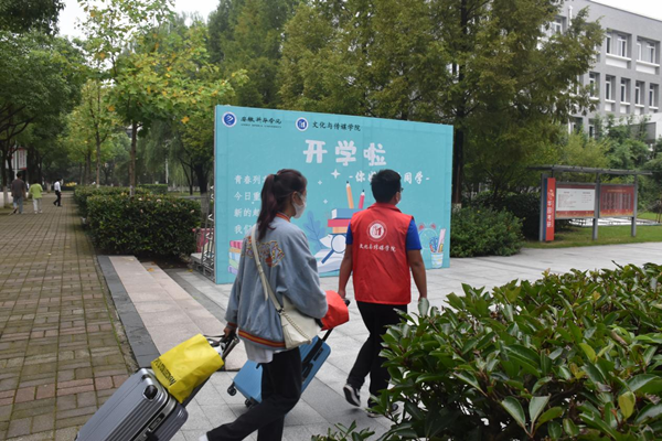在新生进入校园后,由志愿者们协助搬运行李并领入校园,志愿者们积极投入到为新生们搬运行李的服务中,忙碌的背影成为了校园迎新队伍中一道亮丽的风景线。