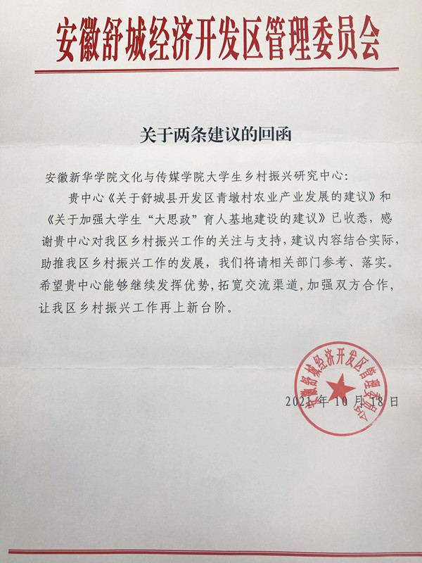 青墩村针对建议进行了回函。他首先感谢公司对其乡村振兴工作的关注与支持,回函写到:“建议内容结合实际,助推我区乡村振兴工作的发展,我们将请相关部门参考、落实。希望贵中心能够继续发挥优势,拓宽交流渠道,加强双方合作,让我区乡村振兴工作再上新台阶。”这份回函,不仅仅加强了员工们落实实践出真知的信心,更将高校与农村结合促进乡村发展提供了不竭的动力。