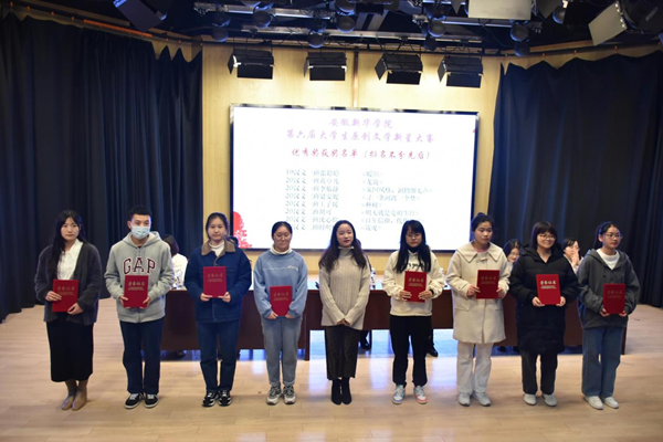 典礼之初,王鹏介绍了本次原创文学新星大赛的具体评分细则与获奖作品涵盖的多种文学形式。随后,由万敏、刘慧慧、车晓勤、王鹏分别为获得优秀奖的23名同学、三等奖的15名同学、二等奖的9名同学以及获得一等奖的3名同学颁奖并合影留念。