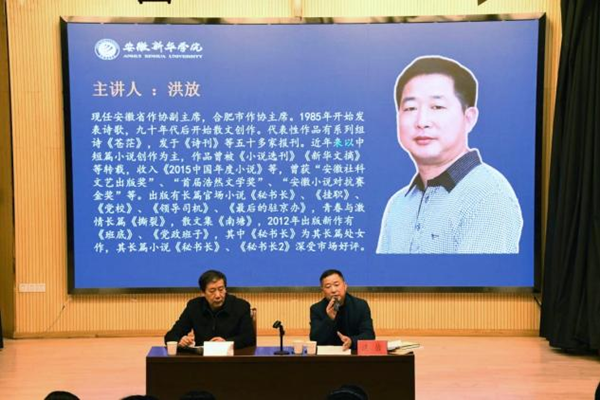讲座上,孙仁歌对洪放百忙之中抽出时间来校开展讲座表示衷心感谢,并介绍了洪放相关写作经历,希望与会人员可以从中得到经验,提高自身的写作能力。