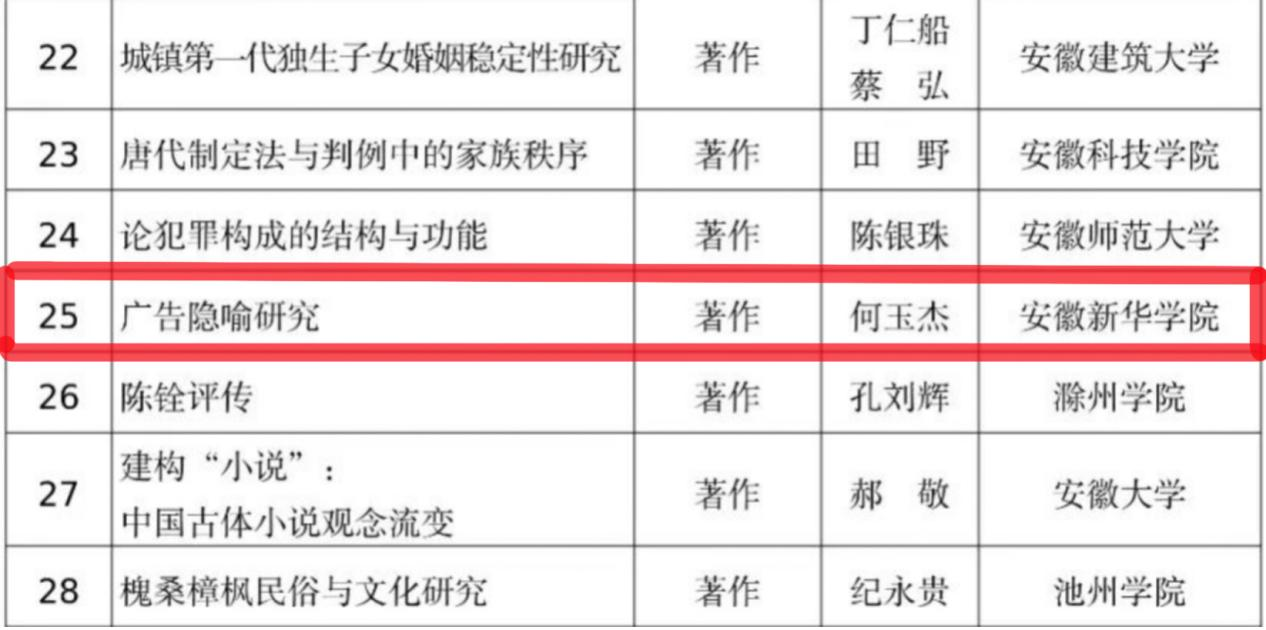 本网讯(通讯员:文霞)日前,安徽省社科奖评奖办发布《省政府批复2019-2020年度安徽省社会科学奖获奖结果》。太阳成集团122ccvip何玉杰教授的著作《广告隐喻研究》喜获安徽省社科奖三等奖,该成果已被公司推荐申报第九届高等公司科学研究优秀成果奖。