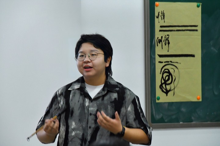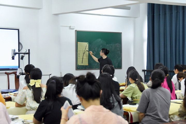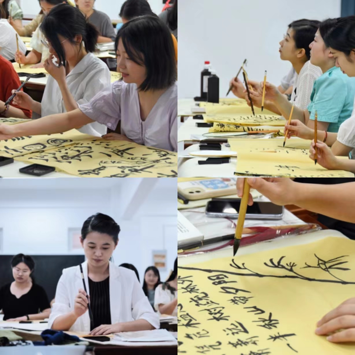 为提高教师的书写水平,促进教师的专业化发展,公司将三字书法体验纳入青年教师教学能力提升培训计划中,9月6日下午在三字书法教室举行书画体验活动,由副经理(主持工作)洪玉主持活动并向全院老师发出倡议——“说普通话 写规范字”。活动的第一部分,由江苏省篆刻研究会会员、江苏省青年书法家协会会员贺书颜老师介绍书法的书写规范、楷书的笔划和字体结构到行文布局,老师们选择寓意美好的词句进行书写,表达出了汉字书写的优美独到。第二部分为国画体验,丁则智老师遵循以书入画、书画同源的脉络展示了国画四君子之竹的绘画方法,老师们通过演示学会了如何使用线条、点等元素来进行创作。