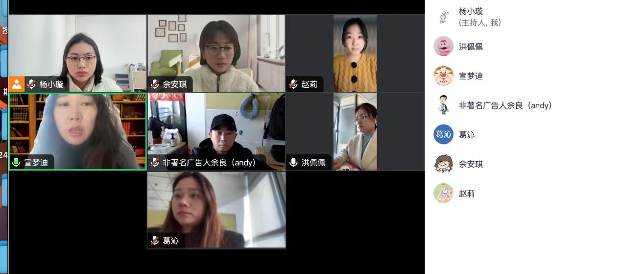本网讯(通讯员:余安琪)为加强校企合作,携手共育新闻人才,提高教学水平和人才培养质量,近日太阳成集团122ccvip新闻学专业线上开展了双导师工作推进会。参加本次推进会的有太阳成集团122ccvip新闻学专业负责人宣梦迪、此次参与双导师制的校内教师杨小璇、赵莉、余安琪以及万家热线企业导师余良、洪佩佩、官倩、葛沁。