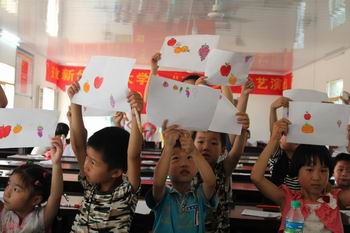 水粉绘画,跟平时的铅笔画图有很大的不同,对于孩子们来说,充满了新奇,跟着老师学画水果和蝴蝶,孩子们聚精会神。课程结束后,看到孩子们的成果,志愿者王少诚笑了,她说,有画的很优秀的,也有画的不太好看的,但都很用心,这才是她真正想看到的。“很累,有时候,嗓子都喊哑了才能勉强维持秩序,但当最后看到他们的作业的一刹那,我又觉得,付出再多都是值得的!”文艺组的志愿者们,用自身的才艺来感染着孩子们,并给予他们一定的接触,在这个过程中,他们付出并收获着。