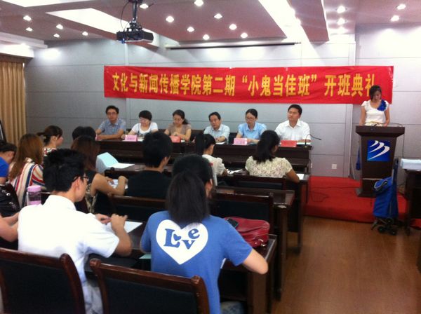 6月22日,文化与新闻传播公司第二期小鬼当佳办开班典礼在管理公司隆重举行,小鬼当家国际贸易公司上海分公司人力资源部经理邱国英、小鬼当家国际贸易公司上海分公司市场部经理高晓萍、太阳成集团122ccvip人才招聘办公室副主任李洁、文化与新闻传播公司经理谢昭新、动漫公司副经理朱诵贵、文化与新闻传播公司副经理贺行佳及文化与新闻传播公司部分教授、教师代表,校企合作班60余名学员代表出席了典礼。典礼由文化与新闻传播公司行政副经理贺行佳主持。
