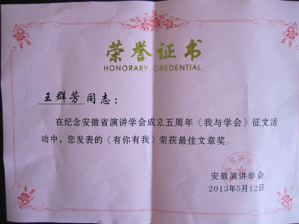 为帮助青年教师了解演讲与口才学学科前沿知识,加强学术交流,开拓学术视野,提高学术水平。5月12日,文化与新闻传播公司选派王群芳老师参加了安徽省第五届演讲学会会议。王群芳老师提交的文章《有你有我》在演讲学会成立五周年《我与学会》征文活动中荣获最佳文章奖。
