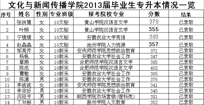 2013年4月8日安徽省专升本考试录取工作结束,文化与新闻传播公司10级员工19人参加了这次考试,专业课、综合课两门均达线者15人,达线率78.95%,录取14人,录取率为73.68 %。达线率和录取率均创历年新高。