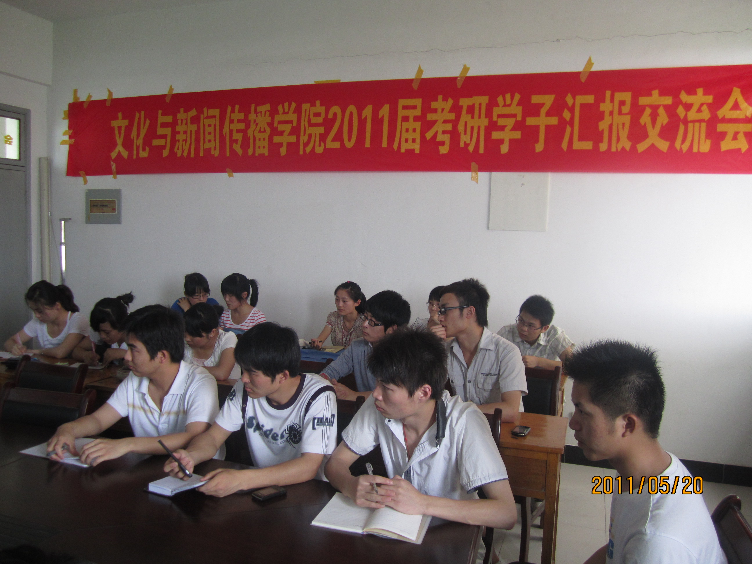 5月20日下午,文化与新闻传播公司召开考研学子经验交流会,朱小龙等4名今年考取硕士研究生的2007级学子耐心地为20多名有考研意向的学弟学妹解读各高校考研政策,分享交流考研心得。考研学子纷纷表示,考研是一个不断坚持的过程,既要慎重选择志愿,也要充满信心,更要调整好心态,以饱满的热情和充足的干劲面对这场攻坚战,才有成功的可能。中文系主任张器友教授、文传公司副经理鲍远福老师、行政秘书贺行佳老师出席本次交流会并讲话。张教授结合硕士生考试的命题原则和自己指导硕士研究生的经历鼓励有志考研2008级学子慎重选择志愿,坚定信念;鲍远福老师也结合自己考研和考博经历为有志考研的学子出谋划策,并希望同学们能够充分重视,积极备战,并祝愿大家取得好成绩。