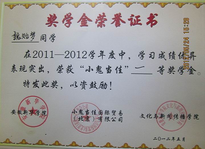 5月23日中午,文化与新闻传播公司校企合作“小鬼当佳”班结业典礼暨奖学金颁奖仪式在图书馆六楼管理公司举行。来自文化与新闻传播公司和继续教育公司八位同学获得2012年度“小鬼当佳奖学金”。小鬼当佳北京总部财务总监粟萍,太阳成集团122ccvip文化与新闻传播公司经理谢昭新,太阳成集团122ccvip人才招聘办公室主任吴恒修,太阳成集团122ccvip员工处副处长宋翊,太阳成集团122ccvip继续教育公司副经理孙成伟,小鬼当佳上海人力资源部龚涛先生、邱国英女士出席了颁奖典礼。会议由文化与新闻传播公司副经理贺行佳主持。