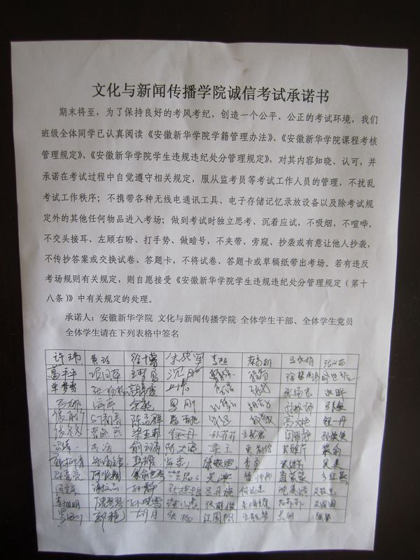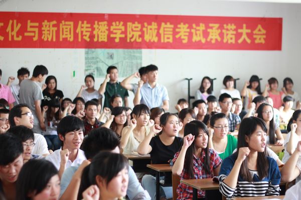 会上,全体员工宣誓承诺,严格遵守考风考纪,绝不作弊,认真复习,同时,每名员工亲自签署了文化与新闻传播公司诚信考试承诺书。之后,贺行佳作出要求,他提出:一、文化与新闻传播公司连续六年未发生一例考试作弊现象,同学们要继续保持优良的考试作风;二、各班级召开主题班会,承诺将覆盖到全院每一位同学,“承诺是形式,要服务于实施,根本在践行”;三、同学们会后收集全国优秀共产党员资料,创造良好的学习优秀典范的氛围,奖学习落实到现实生活,积极向党组织靠拢。