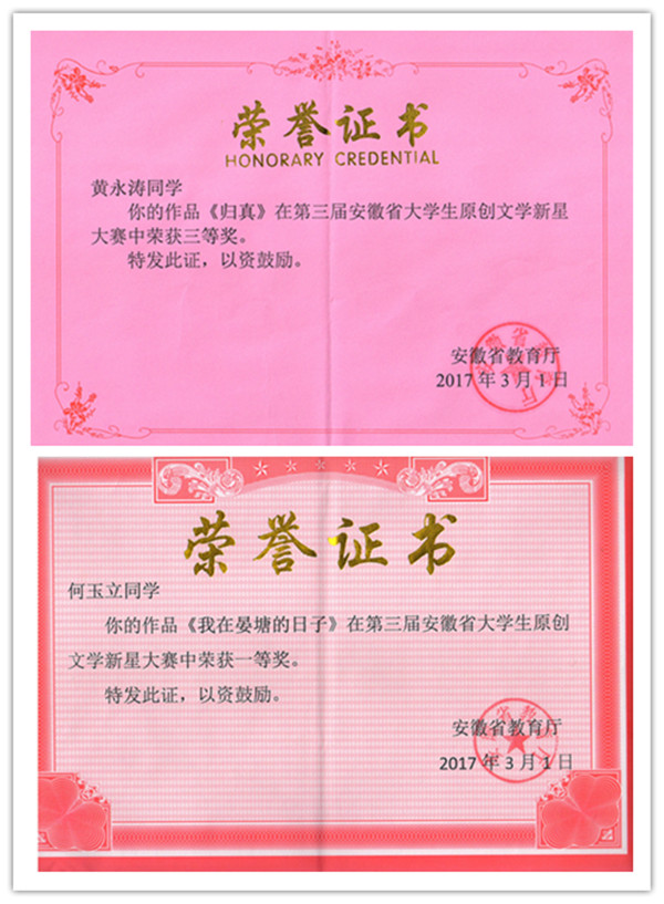 本网讯(员工记者:夏冬润)近日,从省教育厅传来喜讯,在2016年第三届安徽省老员工原创文学新星大赛中,公司文化与新闻传播公司2013级汉语言文学1班何玉立的作品《我在晏塘的日子》荣获一等奖,2016级汉语言文学本科1班黄永涛的作品《归真》荣获三等奖。