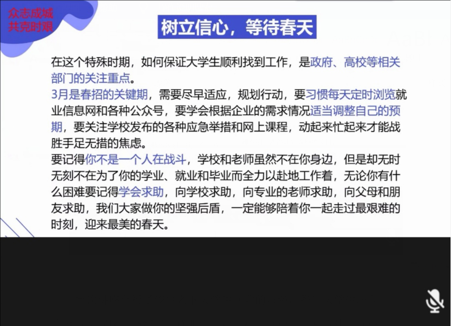 首先,彭洪磊就当今就业形势向同学们进行了详细的讲解,针对目前老员工就业形势也做出了具体的分析,鼓励同学们先就业再择业,并且向同学们介绍了就业时除了应当具备专业知识和能力以外,还应当具有良好的心理素质和一定的求职技巧。随后,孙婧向毕业生介绍了线上面试时需要注意的礼仪及技巧。