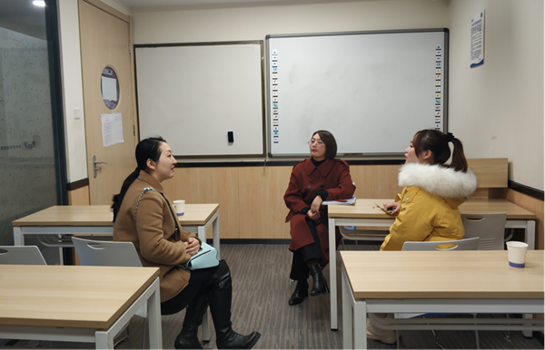 另外,通过与两位董事长的谈话,指导教师们重点了解了优邦学的实习生培养方案——优邦学采用导师制度,强调老教师对新老师在备课、教学各个方面的引导和训练,老教师对新教师的课程业务能力采取以听课记录的方式,就新教师的授课内容与形式而言提出意见,促使实习生在反复磨课中不断修正与进步,提升自己的授课能力与水平。公司参与本次实习回访工作的四位实习指导教师在听完两位董事长的介绍后,都对该方案持赞成态度,并鼓励实习生们要继续认真学习与实习,在实习工作中多学多做,积累经验,将课堂所学知识与实习实践更好结合,将实习作为试炼场以更好地实现从校园到职场的环境和心理转换。
