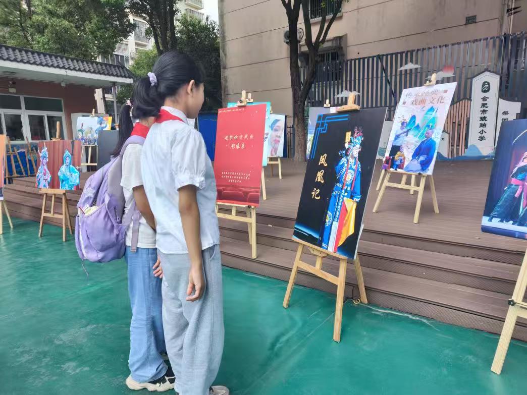 在合肥市第五十中学天鹅湖校区展区,34块主题展板展出来自广播电视编导专业的戏曲影像作品,图文并茂呈现徽剧、黄梅戏等地方剧种艺术精粹,将《天仙配》勤劳美德、《夫妻观灯》家文化等戏曲母题转化为育人资源。“我们按学段设置梯度目标:小学重审美感知,中学强价值认同,大学注文化思辨。”项目负责人介绍,《安徽地方戏曲》课程逐渐构建“展教研”协同机制,辐射大中小一体化育人场景。