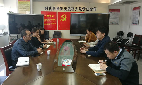 时代新媒体出版社有限责任公司社长阮怀伟等对翟荣兵一行的到来表示欢迎,他简要介绍了时代出版传媒股份有限公司的发展历程和公司现状,重点说明了时代新媒体出版社有限责任公司业务范围和发展前景,时代新媒体出版社有限责任公司总编辑杨小红围绕近几年的业务成果和正在实施的项目课题作了进一步阐述,并陪同参观了新媒体多功能演播室及国家重点实验室——智慧课堂实验室。