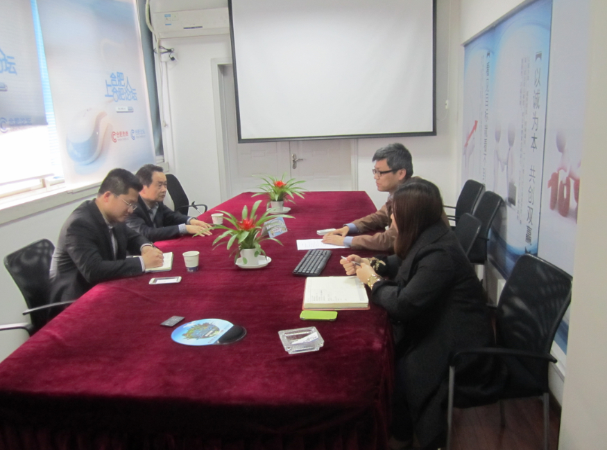 在合肥热线会议室,合肥热线副总经理周强、人力资源管理部经理王芸热情接待了谢昭新一行,双方就实训基地建设,人才培养模式探讨做了深入交流,同时参观了合肥热线公司全景,谢昭新一行还看望了文化与新闻传播公司毕业生优秀员工。