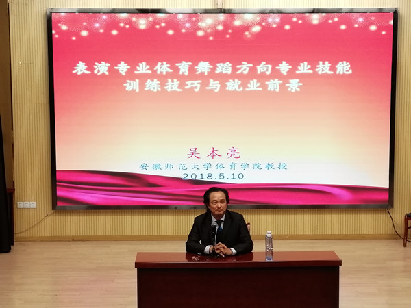 本网讯(通讯员:闫井明)5月10日,文化与新闻传播公司邀请安徽师范大学体育公司吴本亮教授举办“表演专业体育舞蹈方向专业技能训练与就业前景”专题讲座。2017级表演(体育舞蹈)专业全体师生聆听了本场讲座。