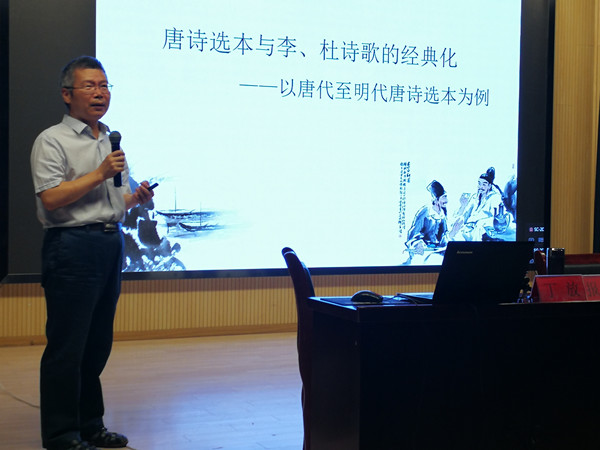 丁放教授详细介绍了历代的经典唐诗选本,并着重统计分析各家所选李杜诗歌的数量及评价,由此得出李杜诗歌经典化过程中的三个发展阶段:唐五代的滞后期、宋元时代的“尊而不亲”、明代的“双峰对峙”。丁教授对于李杜诗歌在各时期不同的接受和传播状况的原因作了理性分析,认为既有政治、经济的原因,也受到文人心态、审美风尚、文献传播手段等诸多因素的影响。丁教授最后强调,古代文学尤其是诗词学习离不开诵读,文学经典作品历久弥新,更值得下苦功夫去阅读和背诵。