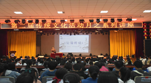 首先,胡教授介绍了此次讲座的主要内容,他提到,《论语》是先秦时期儒家哲学的重要体现,为当代青年人的成长提供一定的借鉴。紧接着,胡教授介绍了孔子的生平以及《论语》的由来,还分别引用传奇的典故与平实的故事为在座的同学们讲解了《论语》中的经典语句。同时,胡焕龙老师从论语中汲取精华,用朴实无华的语言将其核心的忠、义、礼、智、信思想表达出来,教导各位年轻学子要学习“古之学者为己”的精神。随后,胡焕龙教授期望华园学子在未来的学习生活中可以将《论语》思想的精髓践行到每一处,现场响起了阵阵掌声。