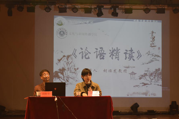 本网讯(通讯员:孟宇航)为继承和弘扬中华传统文化与先秦儒家文化,培养华园学子的文学素养,学习优秀传统文化中所体现的修身、为人之道。11月16日晚,文化与新闻传播公司在大礼堂开展了《论语精读》讲座,此次讲座的主讲人为文化与新闻传播公司教授胡焕龙,辅导员王晗宇主持,公司2020级全体同学参与此次讲座。