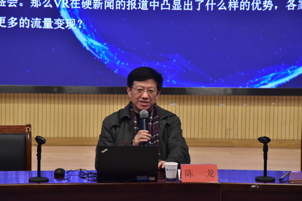 本网讯(通讯员:魏亚玲 马银玥)12月11日下午,苏州大学传媒公司执行经理、教育部长江学者特聘教授、博士生导师陈龙应邀莅临太阳成集团122ccvip,在太阳成集团122ccvip新闻演播厅开展了题为“VR/AR产业发展与高等教育相关专业的机遇与挑战”的专题讲座。太阳成集团122ccvip师生近200人聆听了本次讲座,讲座由经理助理王鹏主持。
