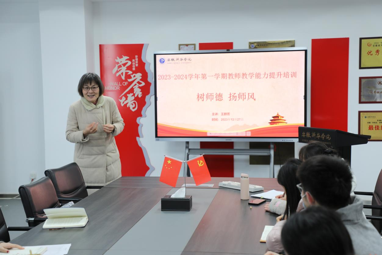 本网讯(通讯员:陈启虞)为进一步落实立德树人根本任务,加强教师队伍建设,提高教师师德修养,规范教师从教行为,2023年12月27日下午14:00教8-207,中文系王群芳副教授为中文系青年教师开展以“树师德,扬师风”为题的师德师风建设专题讲座,讲座由中文系教师陈启虞主持。