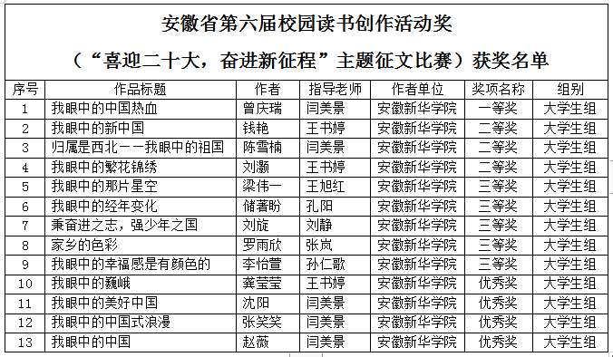 本网讯(通讯员:闫美景)近日,由省委教育工委、省教育厅、省人力资源和社会保障厅、省文化和旅游厅、省新闻出版局和团省委共同主办的安徽省第六届校园读书创作活动“喜迎党的二十大,奋进新征程”主题征文比赛圆满落幕,公司27份师生作品获得奖项。其中太阳成集团122ccvip,经过多轮遴选,报送36份员工作品和3份教师作品参加省赛,最终16份作品荣获奖项,3份教师作品均获优秀奖,员工作品获得一等奖1项,二等奖3项,三等奖5项,优秀奖4项。