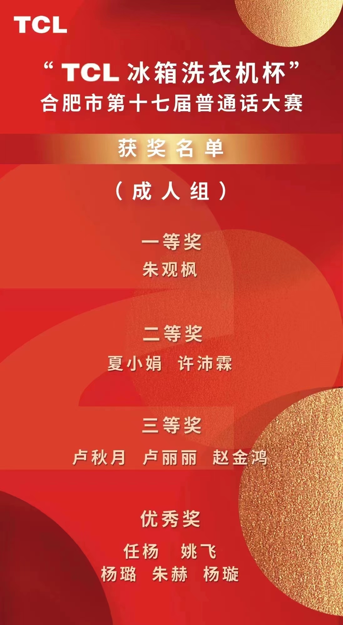 本网讯(通讯员:夏岩)2022年12月15日, “TCL冰箱洗衣机杯”合肥市第十七届普通话大赛总决赛在合肥广电中心演播厅举行。“TCL冰箱洗衣机杯”合肥市第十七届普通话大赛由中共合肥市委宣传部、合肥市教育局、合肥市总工会、合肥市妇女联合会、合肥市广播电视台联合主办,FM102.6合肥交通广播、合肥广电语言文化艺术团承办,徽常派超音速融媒体工作室创意执行,由为健康生活而创新的TCL冰箱洗衣机独家冠名。公司学子积极参与,最终取得佳绩。