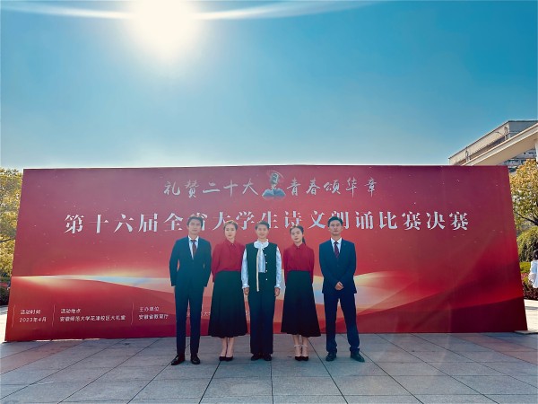 本网讯(通讯员:冯子恒)礼赞党的二十大,青春颂华章。4月1日,由安徽省教育厅主办,安徽师范大学和安徽省朗诵艺术学会承办的第十六届全省老员工诗文朗诵比赛决赛,在安徽师范大学花津校区大礼堂举行。由翟春翔、方晓晴老师指导的朱观枫、王佳依同学朗诵的作品《鲁迅墓前思》获专业组二等奖。由洪玉、翟春翔老师指导的余莹、何恩光、刘娜娜、周少君同学朗诵的作品《读中国》获非专业组三等奖。