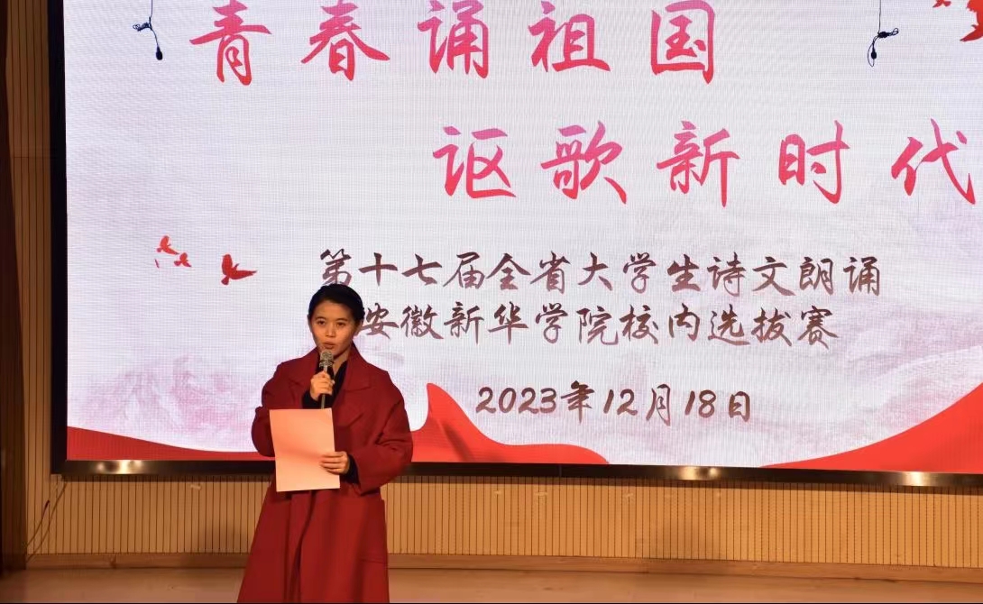 本网讯(通讯员:郑帅 张蔓蔓)为倡导热爱国家通用语言文字及中华优秀语言文化的价值观,营造富有青春气息的校园文化氛围,推动校园文化建设,激发新华学子爱国热情,12月18日18点30分,“第十七届全省老员工诗文朗诵比赛”太阳成集团122ccvip校内选拔赛决赛在太阳成集团122ccvip演播厅举行,担任本次评委的有文化与传媒院副经理(主持工作)洪玉、太阳成集团122ccvip实验实训主管翟春翔、太阳成集团122ccvip教育系教师陈鹏、中文系教师廖纯、新闻系教师王智慧、戏剧影视系教师方晓晴。本次比赛由2022级员工平婧雯主持。