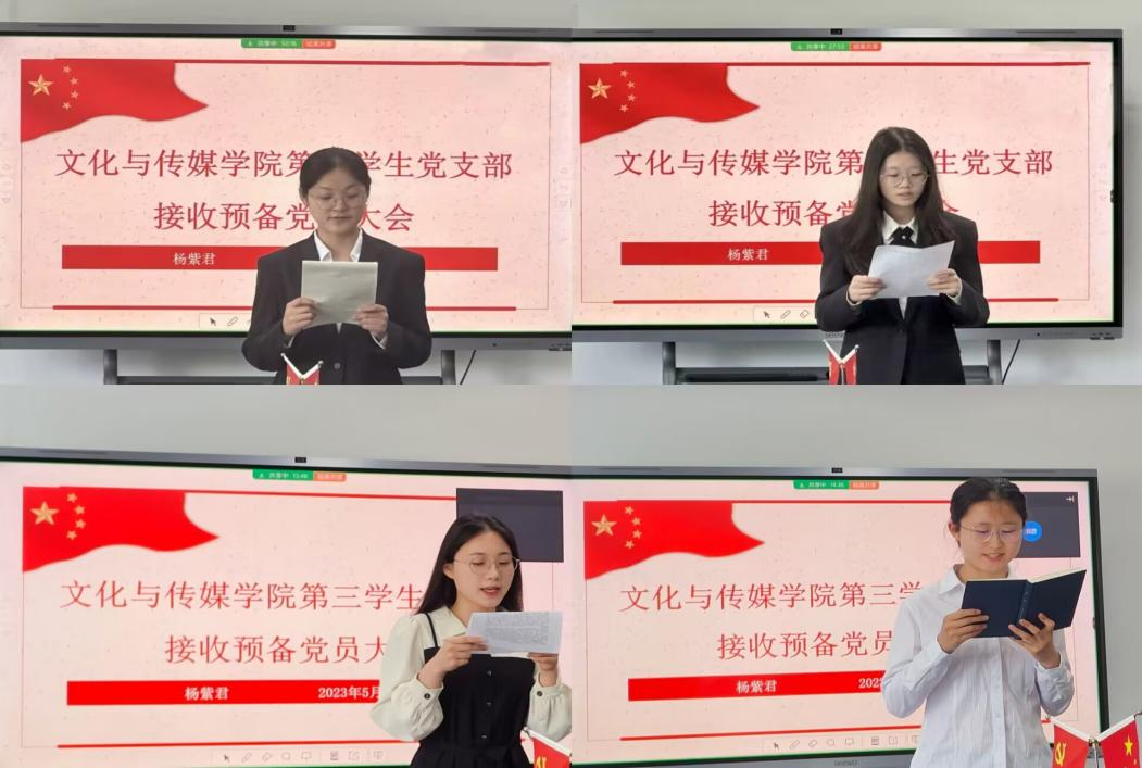 此次会议严格按照党组织接收预备党员程序展开。依次由殷睿等22名发展对象结合自身对党的认识、入党动机、个人经历及在校表现等依次向党组织进行汇报。由入党介绍人分别介绍她们的基本情况,并对其能否入党表明自己的意见。杨紫君同志代表支部委员会向全体党员报告了党支部对上述同志的政治审查情况。与会党员针对发展对象的各项情况进行充分的讨论,大家一致认为殷睿等22名同志自提交入党申请书以来,努力学习关于党的理论和知识,积极主动向党组织汇报自己的各项情况,积极参加党支部组织的各项活动,积极投身于为人民服务的队伍中,现实表现符合党员标准。经与会正式党员无记名投票表决,大会一致同意接收殷睿等22名同志为中共预备党员。