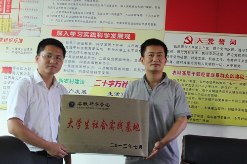 驮着笨重的行李、带着满怀期待的心情 ,在文化与新闻传播公司行政副经理贺行佳的带领下,13名志愿者踏上此次三下乡的行程。一路上的奔波,直到晚上6时,才到达宿松县河塌乡乡政府,河塌乡团委书记陈雪松及斗山河村书记王康武、副书记徐宿海、以及委员吴存安迎接并举行了老员工暑期社会实践挂牌仪式,宿松县团委书记石必键电话慰问并祝贺挂牌,随后,王书记给志愿者们安排好了住处。