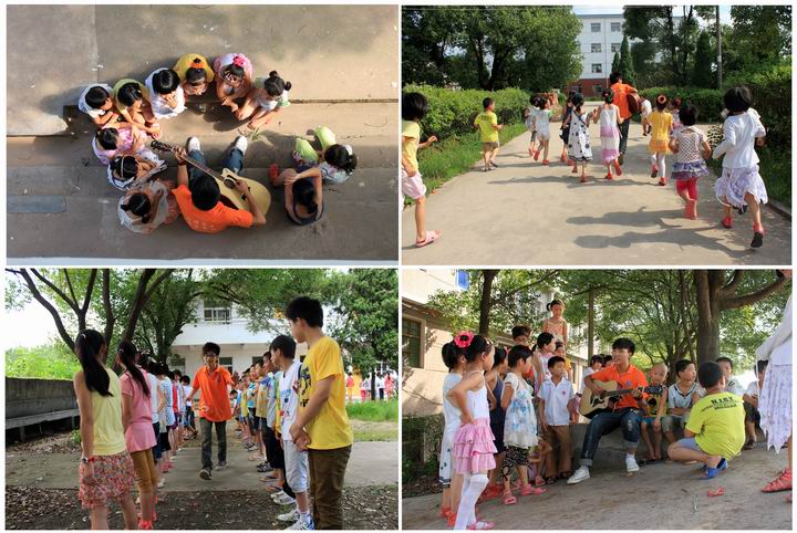 张朋燕、张朋飞姐弟俩自从知道小分队来支教以后,每天从早到晚都紧紧跟随着队员们学习玩乐。因为张爷爷是当地小学的退休教师,从小培养的姐弟俩都很活泼开朗,他们看到所有支教队员都能满脸笑容的扑进怀里,让队员们都感到非常亲切。中午休息时,队员们经过上午的忙碌后都来到临时住所休息,然而他们姐弟俩吃完饭后就立即来到公司找队员们玩耍,支教组每天中午只好轮流安排一位队员专门看护他们。“虽然累一点,但我们感到很开心、很充实,能和这么多小孩建立友谊是一件很有意义的事情。”队员程小文向笔者袒露的自己的心声。