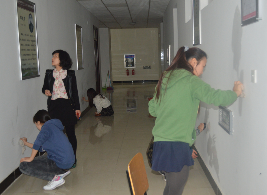 (文/许玮)4月18日中午,文化与新闻传播公司第三支部书记赵影老师带领11级新闻班、12级文秘班和13级新采班的党员、预备党员、入党积极分子以及共青团员的部分成员们,在文传公司三楼集合,开展志愿劳动周活动。