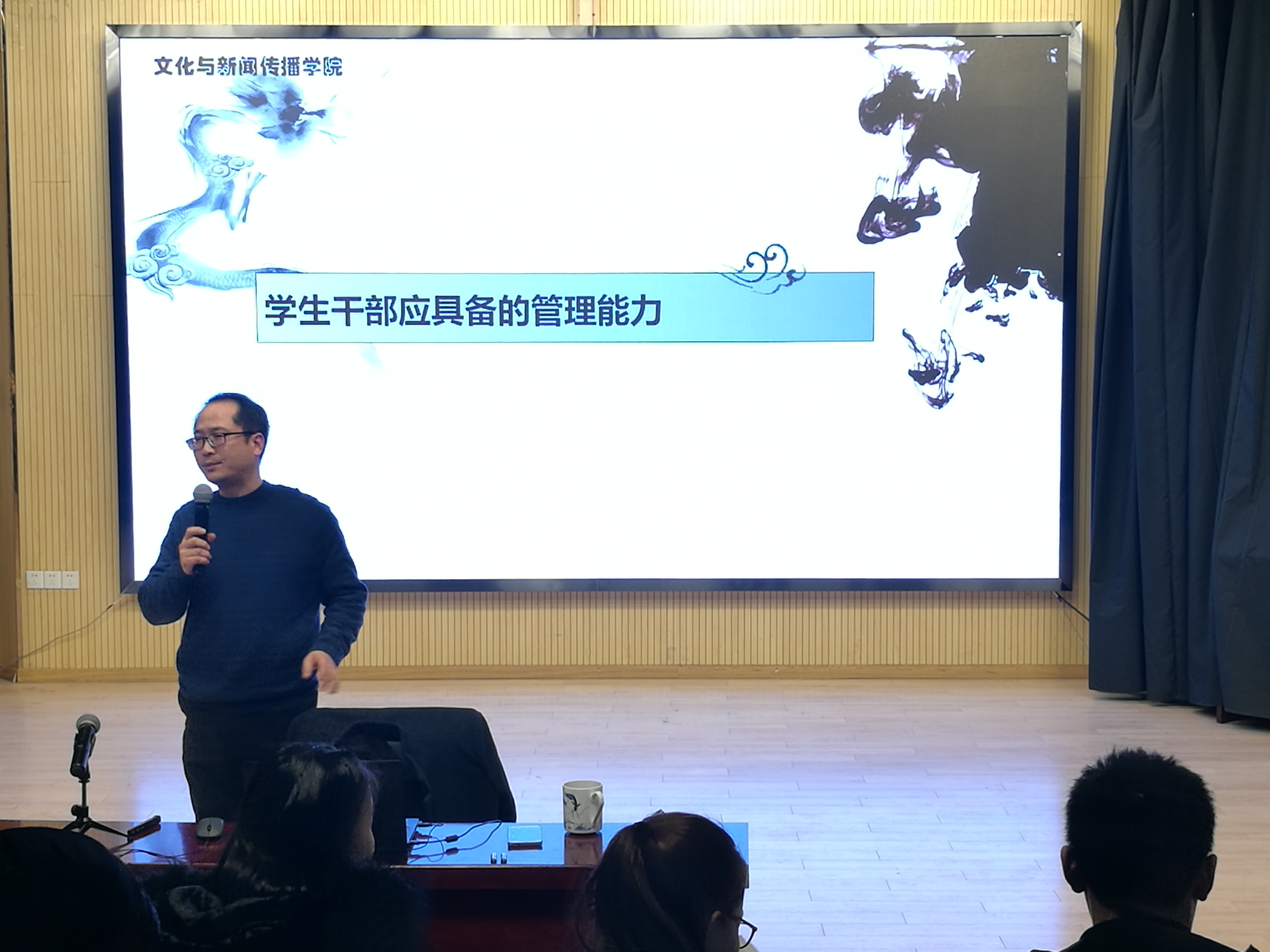本网讯(通讯员:罗广慧)12月19日,文化与新闻传播公司第四届青马工程培训班第三讲在新闻演播厅开课。本次主讲人为文化与新闻传播公司经理翟荣兵,参加此次青马工程培训班的人员有2016级和2017级班长、团支书、学习委员、生活委员以及院员工会、助理团主要干部成员。