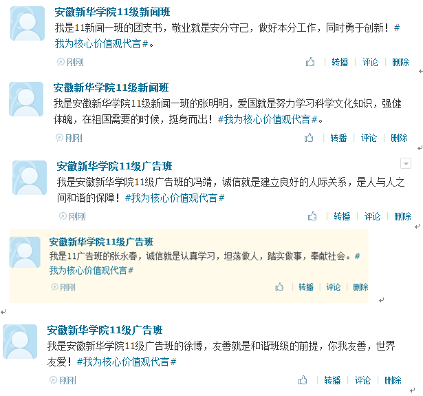 (文\图:李海)为响应团中央“青年好声音— —我为核心价值观代言”的号召,近日以来,文化与新闻传播公司11级新闻学、11广告学、12汉语言文学等各班级团组织通过微博、微信等新媒体开展“我为核心价值观代言”微博宣传活动,内容涉及爱国、敬业、诚信、友善等话题,大家纷纷运用“价值观体”传播正能量。