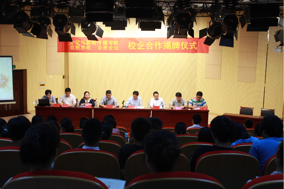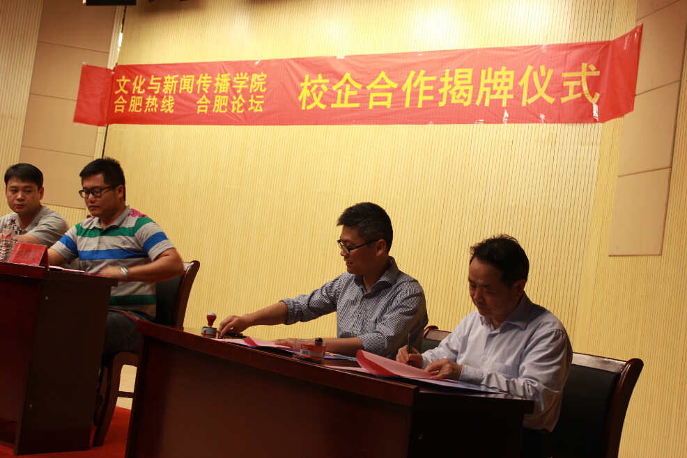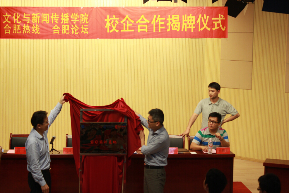 5月22日下午,文化与新闻传播公司与合肥热线、合肥论坛在演播厅举行校企合作揭牌仪式。莅临现场的有公司副经理马凤余,文化与新闻传播公司经理谢昭新,合肥热线副总经理周强,合肥论坛互动中心经理黄鹤松等领导,仪式活动由行政副经理贺行佳主持。
