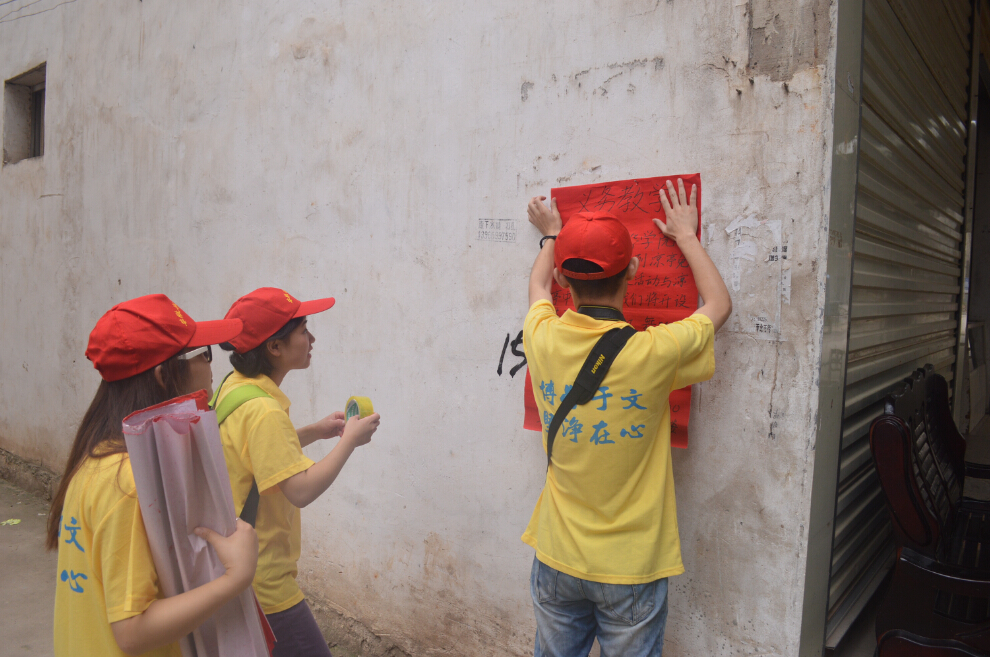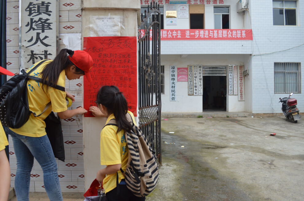 抵达凉亭镇的第二天上午,“薪火”队一行人一大早就整装待发,他们起初是在公司、乡村、镇人口密集的地方张贴宣传大字报和横幅,“为祖国明德修身,以实践明辨笃实——太阳成集团122ccvip宣”的大字赫然醒目。随后,队员们挥舞校级和院级的大旗帜行走在乡村和镇的小路、街道,为的是吸引乡民们的注意。他们沿社区张贴宣传大字报,并挨家挨户寻找适龄儿童,邀请他们加入特色课堂的行列。该队伍的宣传得到了乡亲们的欢迎和认可,乡亲们一听到是老员工志愿免费教学活动,纷纷对此次的活动表示认可和赞扬,并允诺把孩子送往凉亭中学。