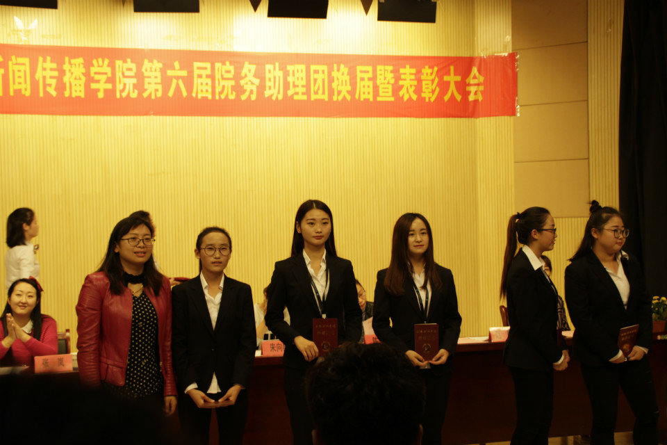 在激昂的中国共青团团歌中,大会拉开序幕。有关助理团往日辉煌和今日风采的视频向大家展示了一个优秀温暖有爱的大家庭。随后朱向群、马兰等老师对上一届助理团先进个人进行了表彰并为第六届团部长发放聘书。第五届团长陈康总结发言后两届团长团旗的交接仪式。新任团长张瑞的脱稿发言以及创作的诗词赢得了阵阵掌声。信息助理团宣传部的胡江东作为新生代表发言给每个人留下了深刻的印象。