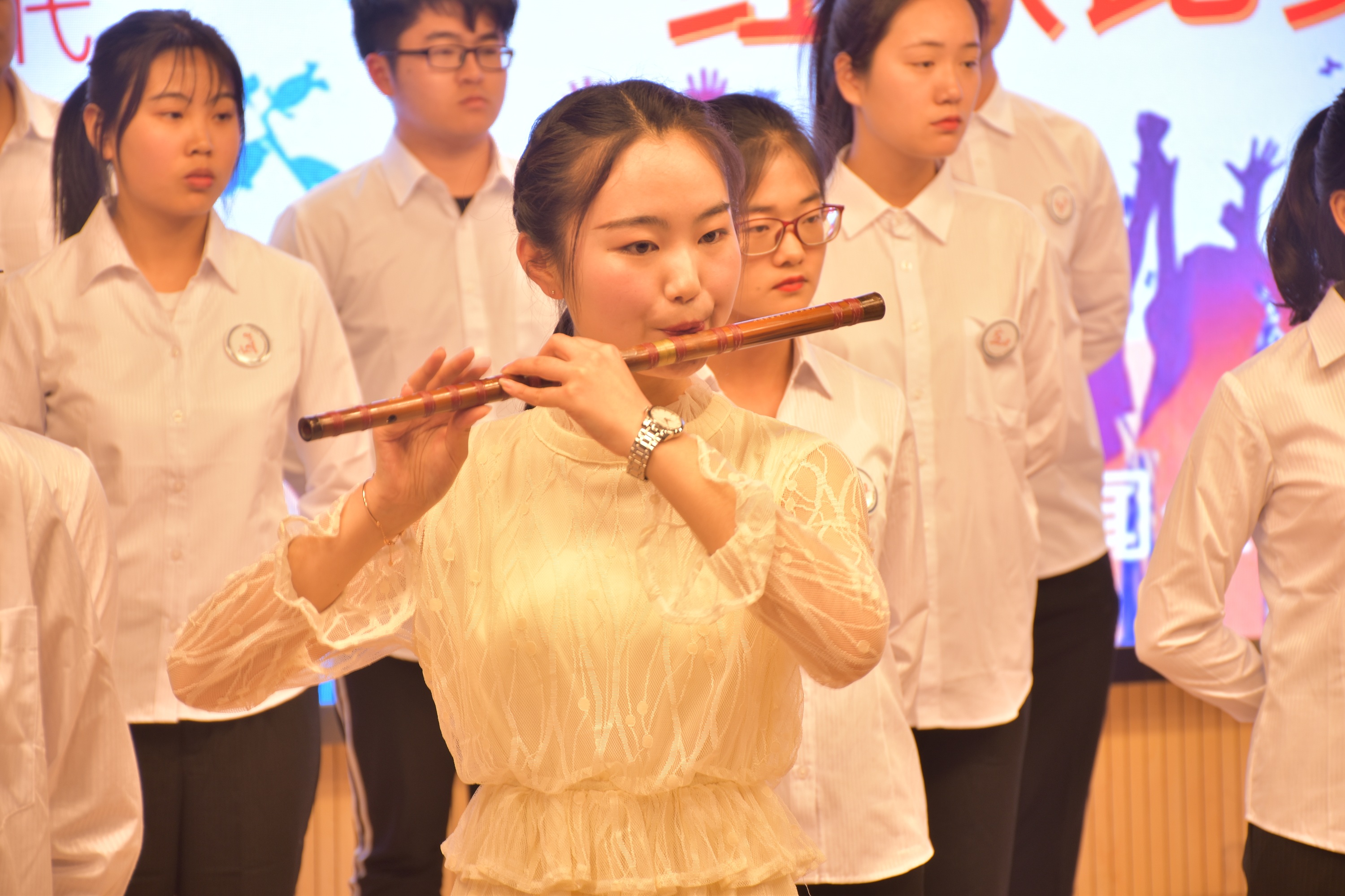 同学们服装统一,精神饱满,歌声嘹亮,各班根据自身专业的特点进行创新。其中2018级汉文3班穿着鲜艳美丽的礼服演唱《相亲相爱》并得到了评委老师的表扬,2018级汉文2班男生们洪亮的歌声赢得了评委老师的赞赏。最后以压轴出场的2018级广告二班在演唱《明天会更好》时穿插了笛子独奏,使得观众眼前一亮。各班的视频图片、班徽、班旗、班服,适当的手势队形,给台下观众带来了一场视觉盛宴。经过激烈的角逐,2018级广告2班获得一等奖,2018级汉文1班和2018级汉文3班获得二等奖,2018级汉文2班、2018级新闻1班、2018级新闻2班获得三等奖。此次比赛在热烈的掌声中拉下帷幕。