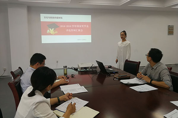 本网讯(通讯员:彭洪磊)9月29日,文化与新闻传播公司2018-2019学年国家奖学金评选汇报答辩会在207会议室召开。文化与新闻传播公司副经理朱向群、经理助理王鹏以及主管秘书担任评审,参加此次答辩的有2016级、2017级、2018级各专业15名本科生。