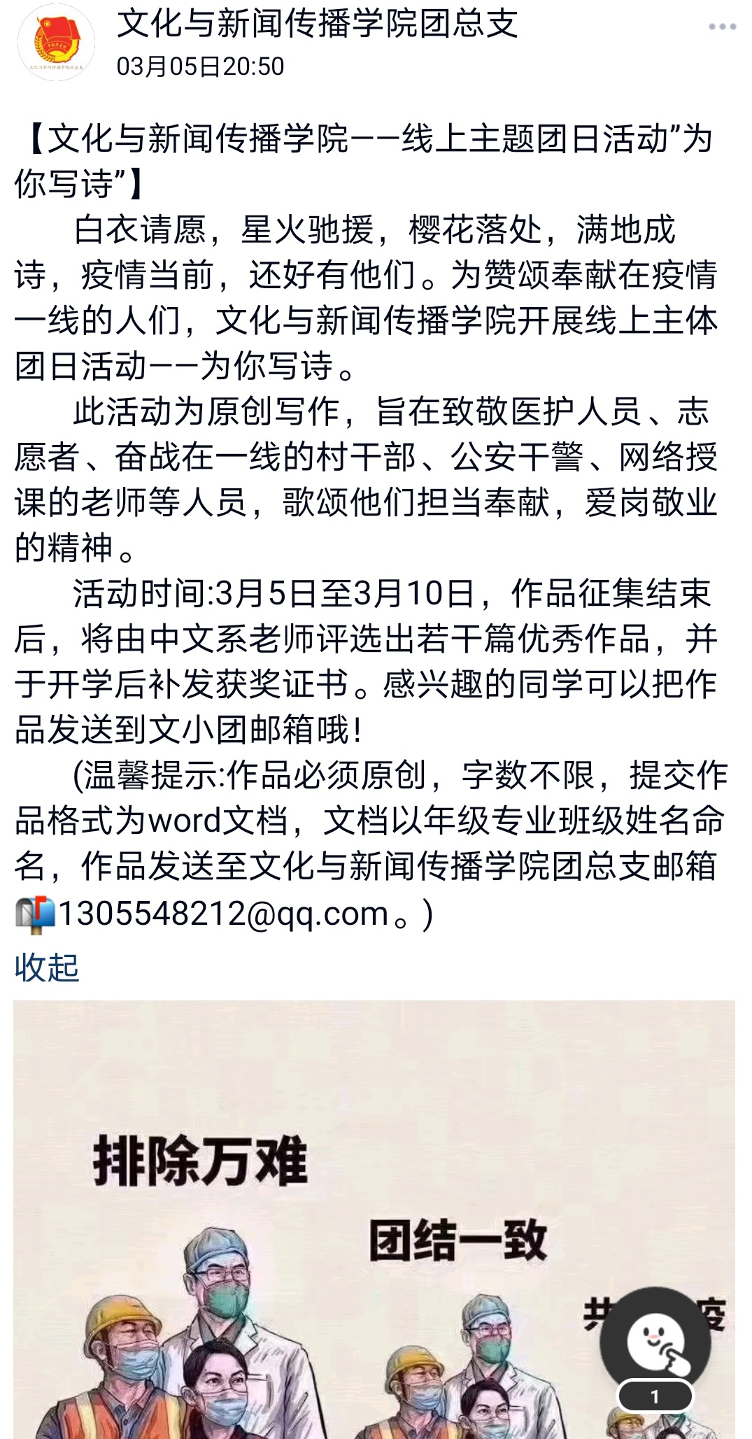 本网讯(通讯员:彭洪磊、左晶晶)在抗击新冠肺炎战“疫”中,无数白衣战士在前线与病毒抗争,许多默默无闻的战士、志愿者也在后方支持防疫工作。为致敬抗疫一线勇士们舍己为人、无私奉献的积极风貌,文化与新闻传播公司团总支于3月5日-3月15日举办“为你写诗”主题征文活动,用“云能量”凝聚华园学子打赢疫情防控阻击战的精神力量。