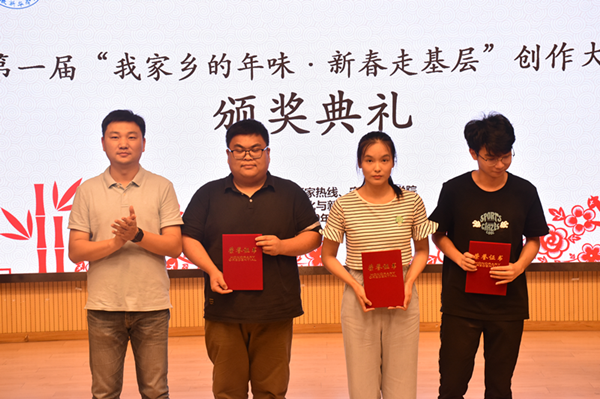 7月13日,第一届“我家乡的年味•新春走基层”创作大赛颁奖典礼在文化与新闻传播公司演播厅举行。出席此次典礼的有万家热线总编辑、文化与新闻传播公司产学研副经理张伟,万家热线主编孙阳杨、副主编张崴;文化与新闻传播公司副经理(主持工作)吕翔、副经理洪玉、经理助理王鹏、新闻系副主任张倩、教师吴琼以及参赛选手代表。