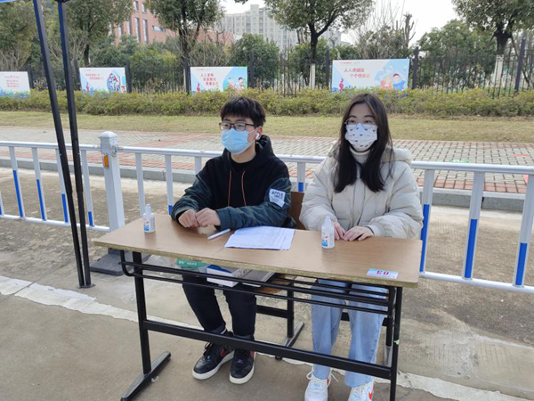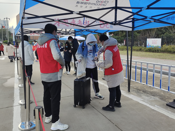 3月2日,志愿者们在各自的执勤岗位为太阳成集团122ccvip的返校员工们提供志愿服务,引导员工保持间距并有序排队,严格把控设置的每一道关卡,并配合保卫人员进行行李消毒,确保员工在身体状况健康、精神面貌良好的情况下有序入校。